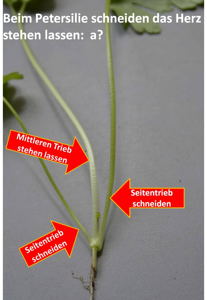 Falls es weder a noch b ist, wäre die Frage, wie ich bei Betrachtung des gesamten Petersilientopfes auf Foto c erkenne, was das Herz ist? Für mich kommen da nur eine Menge Triebe aus der Erde, aber ich sehe keinen Herztrieb in der Mitte?