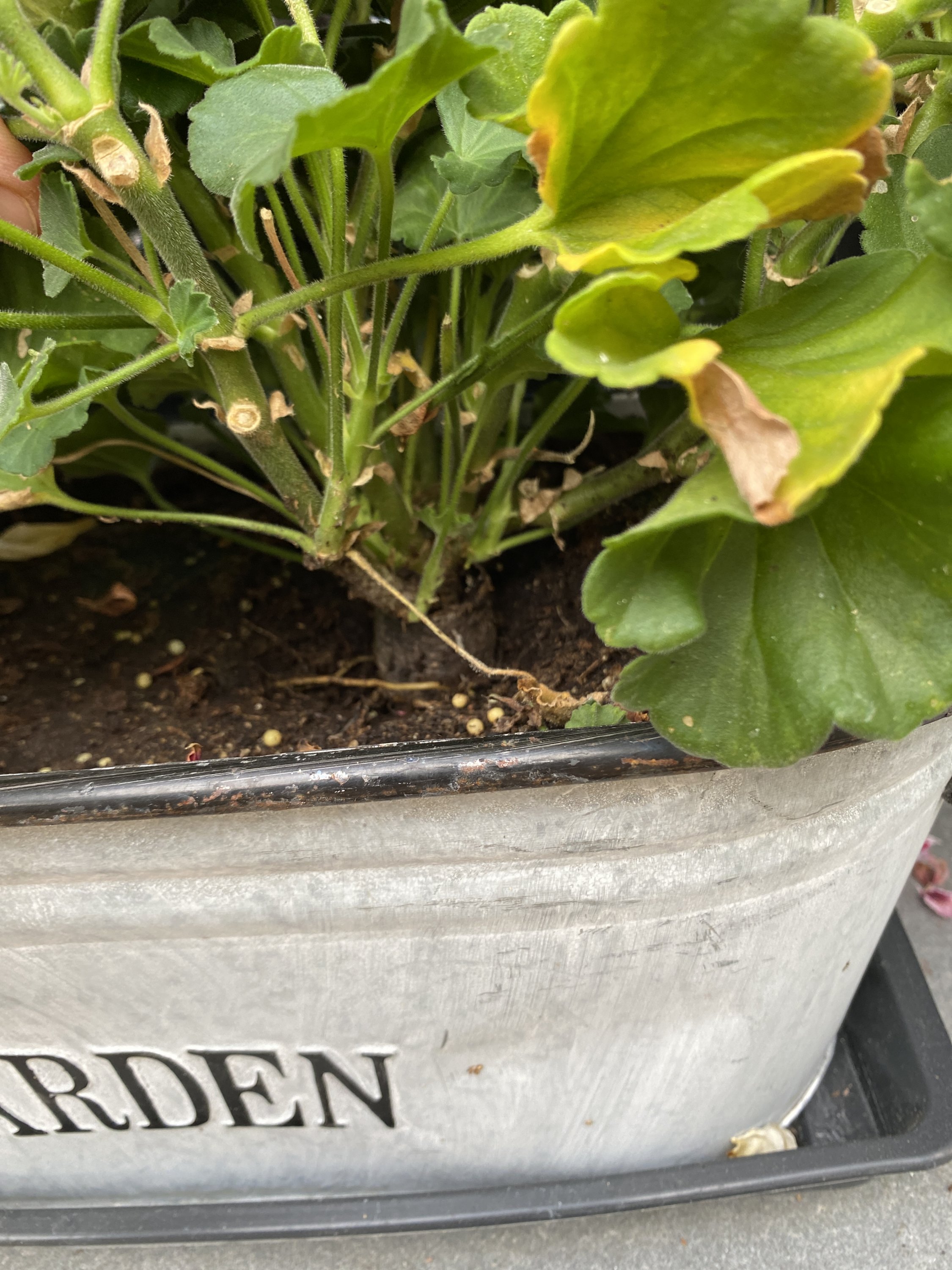 Auf dem Foto sieht es für mich so aus, als würde die Geranie noch in dem Anzucht-Netztopf sein, der eine Weiterwurzelung behindern könnte. Eigentlich lösen die sich mit der Zeit auf. Weiterhin seien ja sämtliche Geranien von der selben Gärtnerei... also werden das alle haben.