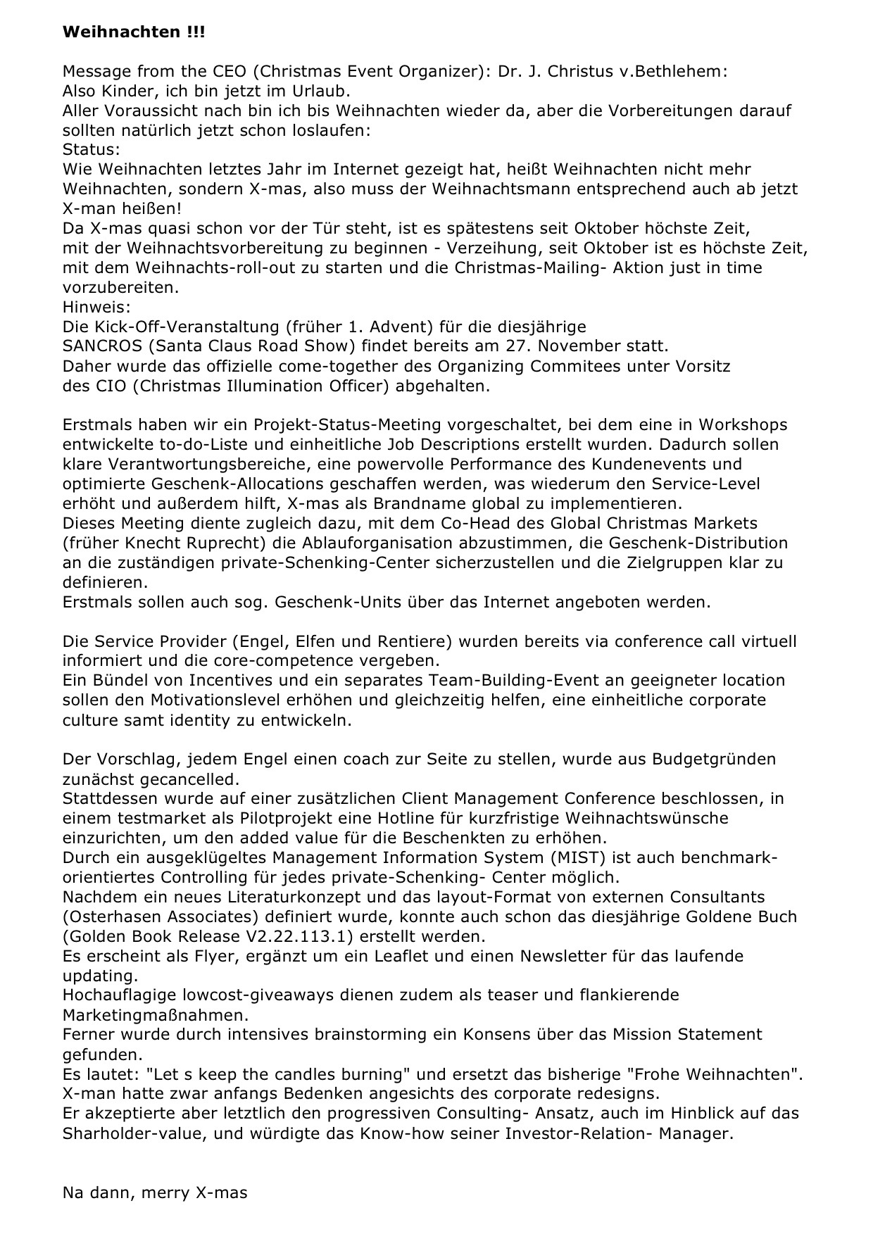 Grüß Dich, Stachelbär,Daumen hoch, das bedeutet nicht dass mir das gefallen hat, was ich da gelesen habe,Hier ein recht sarkastischer Aufsatz zu den Entwicklungen rundum Weihnachten, den ich vor einigen Jahren erhielt.